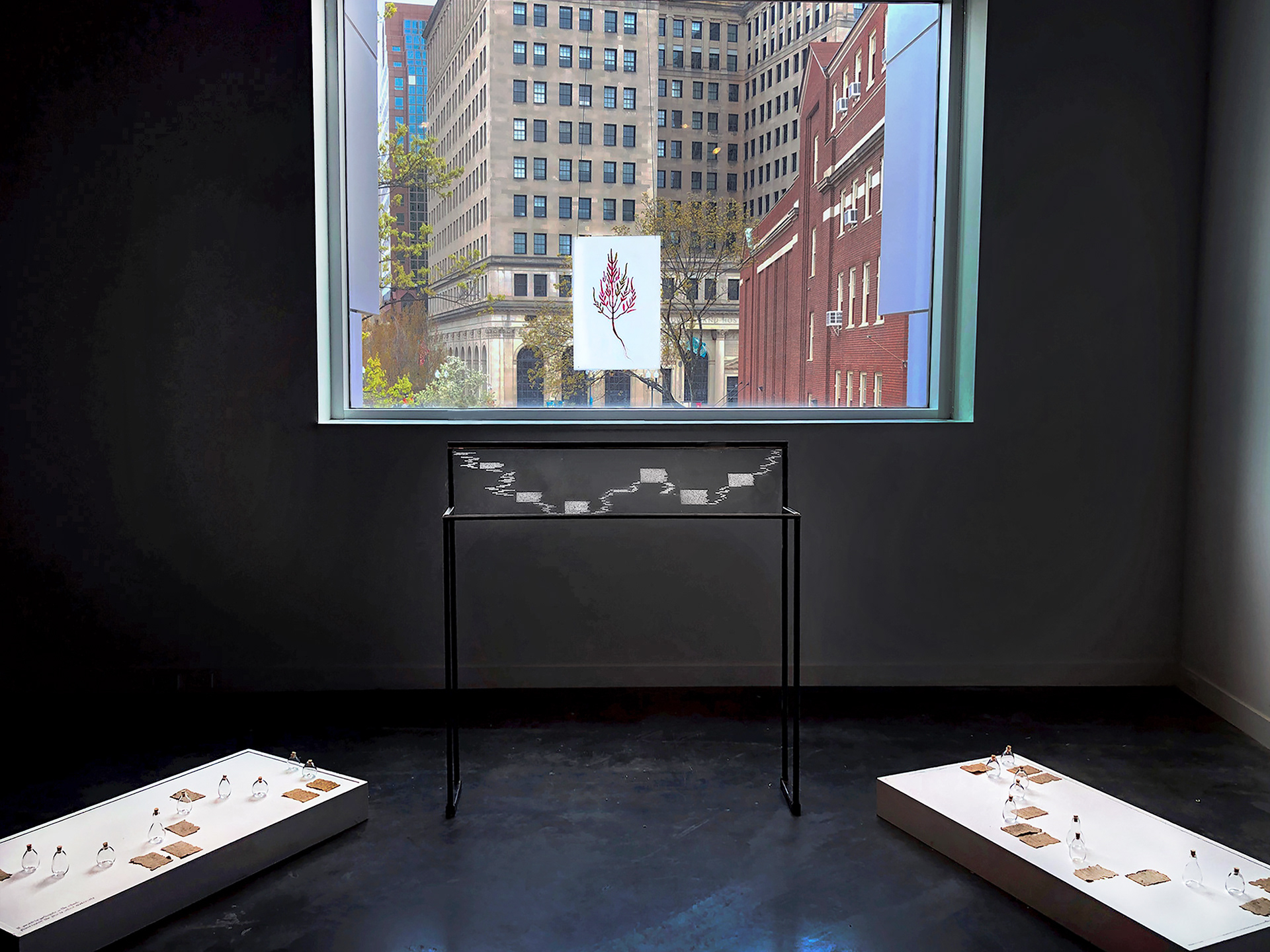 Flux is a participatory installation-- a collaborative gesture interconnects tears, shoreline, softening of molten glass, salt marsh, and the encroaching tide, delivered to the public by Mariel Solomon and Yiyi Wei. The research revolves around a plant, named Salicornia, that grows in salt marshes found on the shorelines all over the world. Its ability to thrive under harsh saltwater environments makes the plant act as harbors to living beings on the coast. It is consumable by humans and other animals living by the water. It is also slowly disappearing due to the rising sea level. Salicornia has another name-- Glasswort. Because the plant contains high sodium content when adapting to the salty environment, historically it was burnt in the process of glass making to create fluxes that soften the molten silica. The softened glass can be used to blow or shape. In this installation, hand-blown tear bottles were given out to participants alongside instructions written on paper made by the artists from dehydrated Salicornia collected on the winter Rhode Island shores.