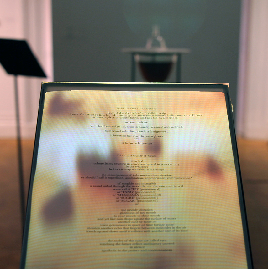 Researching into the history of cane sugar, the artist was curious if she could excavate a path that this material traveled across countries and landscapes by looking at the way names of sugar were being translated. In this research, she found a scroll roll that its front side contained a holy Buddhist script and on the back, a list of instructions to make cane sugar. The scroll carried by Indian monks introduced the process to Chinese artisans, who then refined this process and carried it back to India. The recipe also recorded an unfamiliar name of cane sugar in Chinese, which is a direct translation from Sanskrit. This discovery inspired famous Chinese scholar and linguist Ji Xianlin to research the history of cane sugar and its significance in cultural communication.