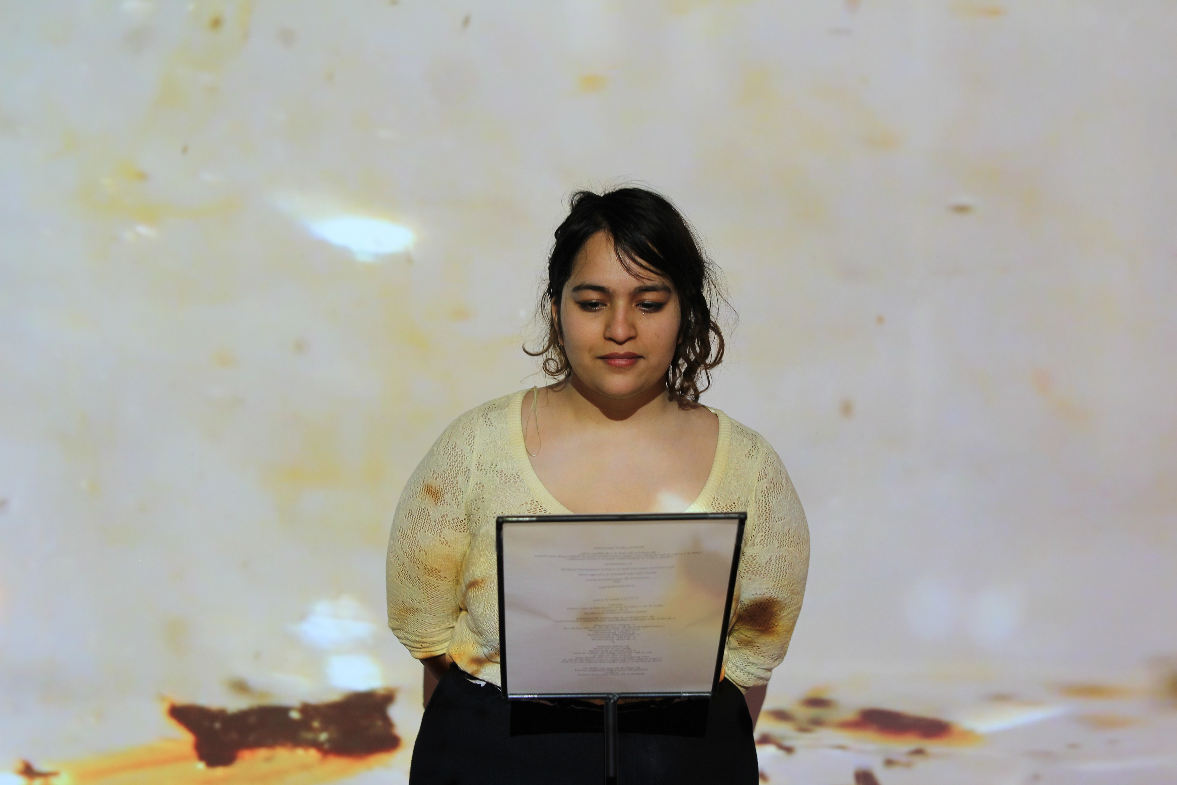 In the installation, P3303 is a cluster of Nouns; Yiyi Wei removes her own presence from the piece. The poem is printed on vellum as part of the reading stand, inviting viewers to step into the landscape. The translucency of the vellum captures glimpses of the falling sugar, creating the foreground. The participants occupy the in-between space, and the video projection extends to the faraway. Every reader brings a different history, memory, and language to the piece, thus completing the installation.