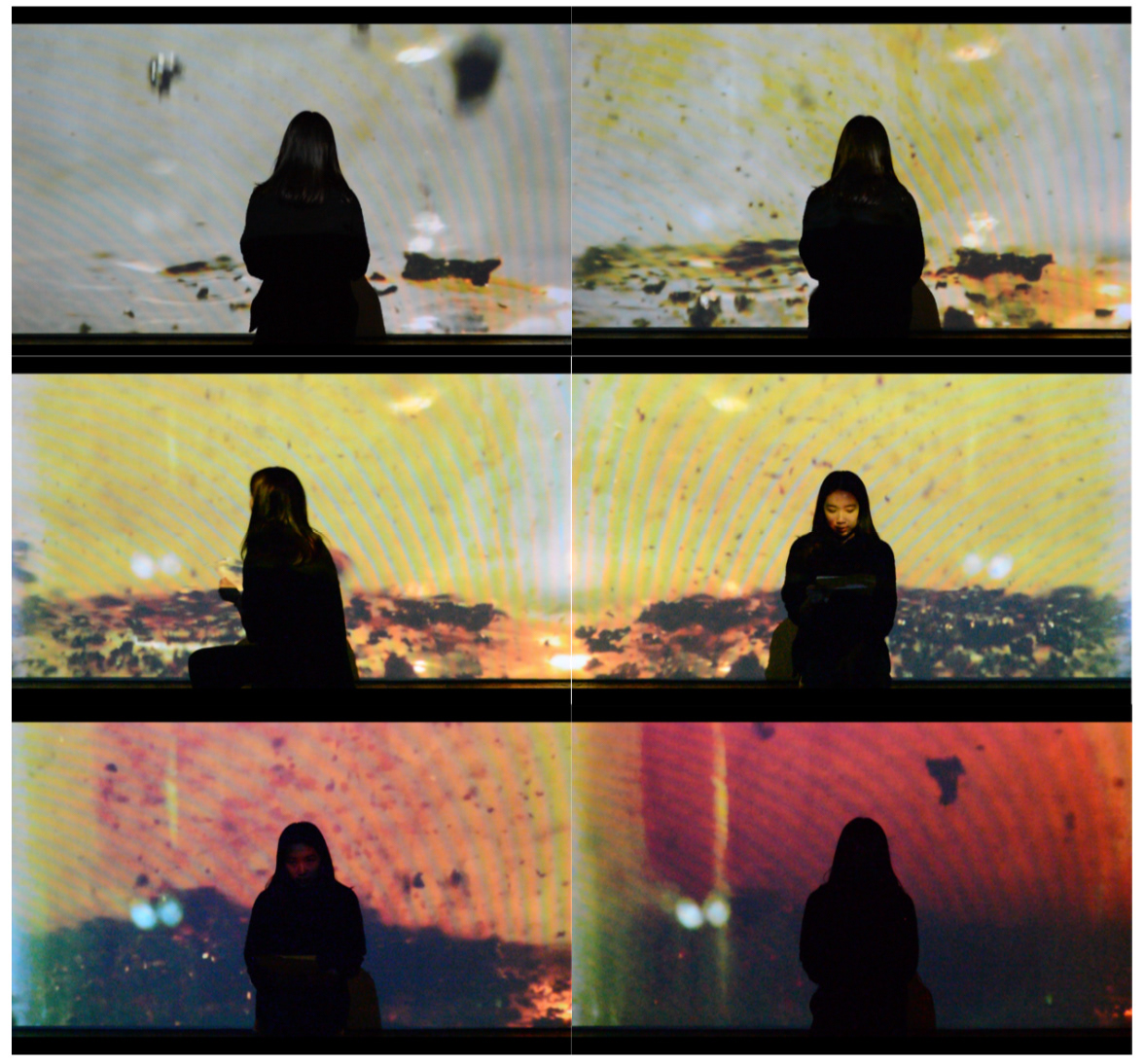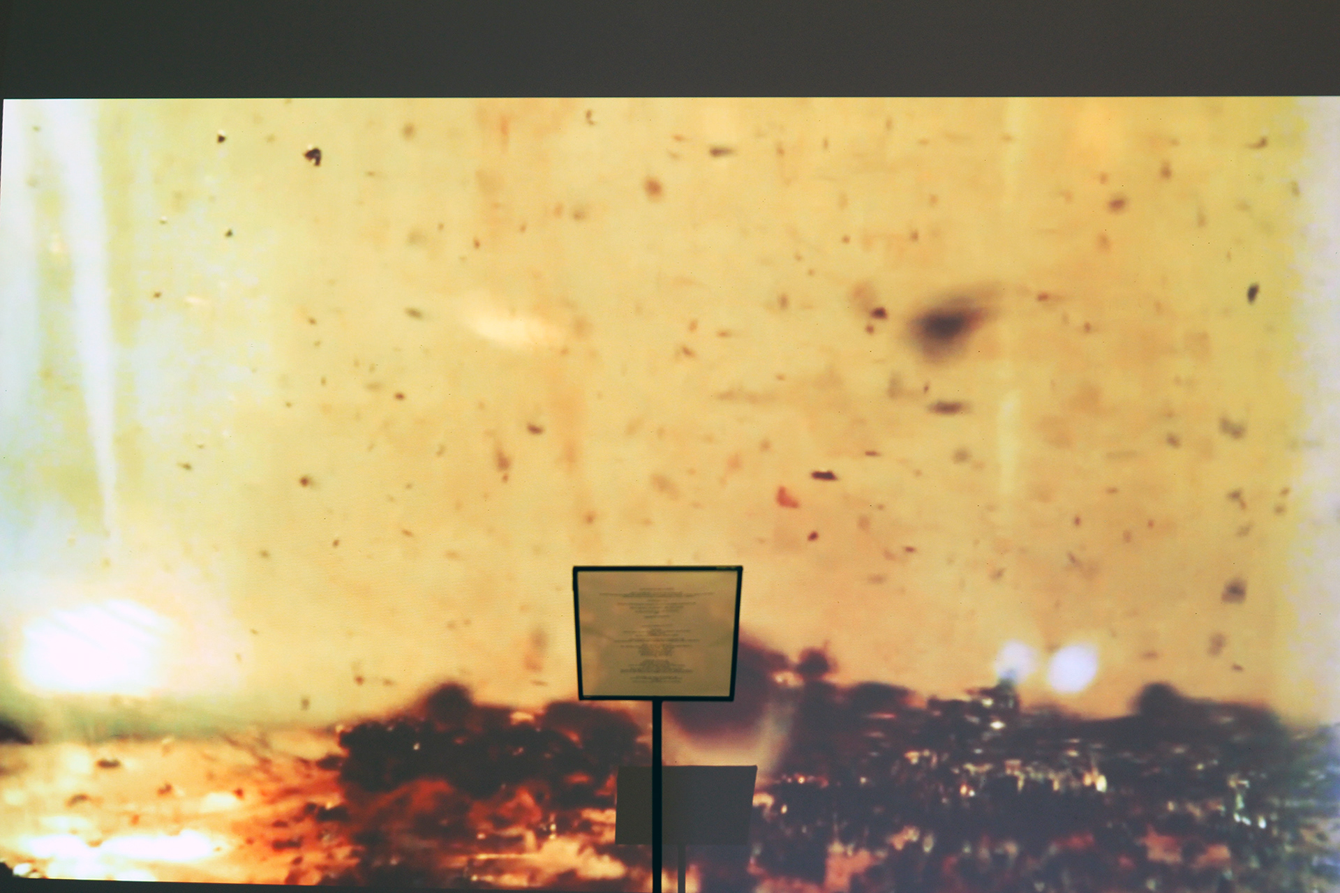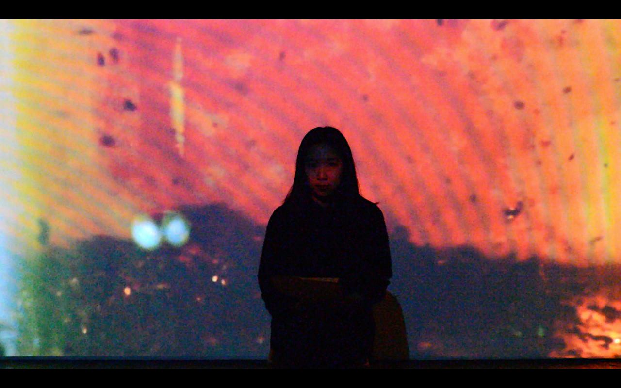This performance was created after the poem P3303 is a cluster of Nouns. Pieces of fresh sugar cane were used for extracting juice by the artist, and then boiled from a body of liquid to a solid. Afterward, a video was taken and projected in the performing space to establish an immersive environment, depicting how cane sugar transforms from its solid state to a liquid state, while the precipitates create a landscape far away. The artist, situated in front of the video, becomes part of the landscape and slowly reads the poem to the audience. Some solid sugar particles break apart, some move up and down, some dissolve and diffuse in the water, telling a story alongside P3303 and the names of [sugar].