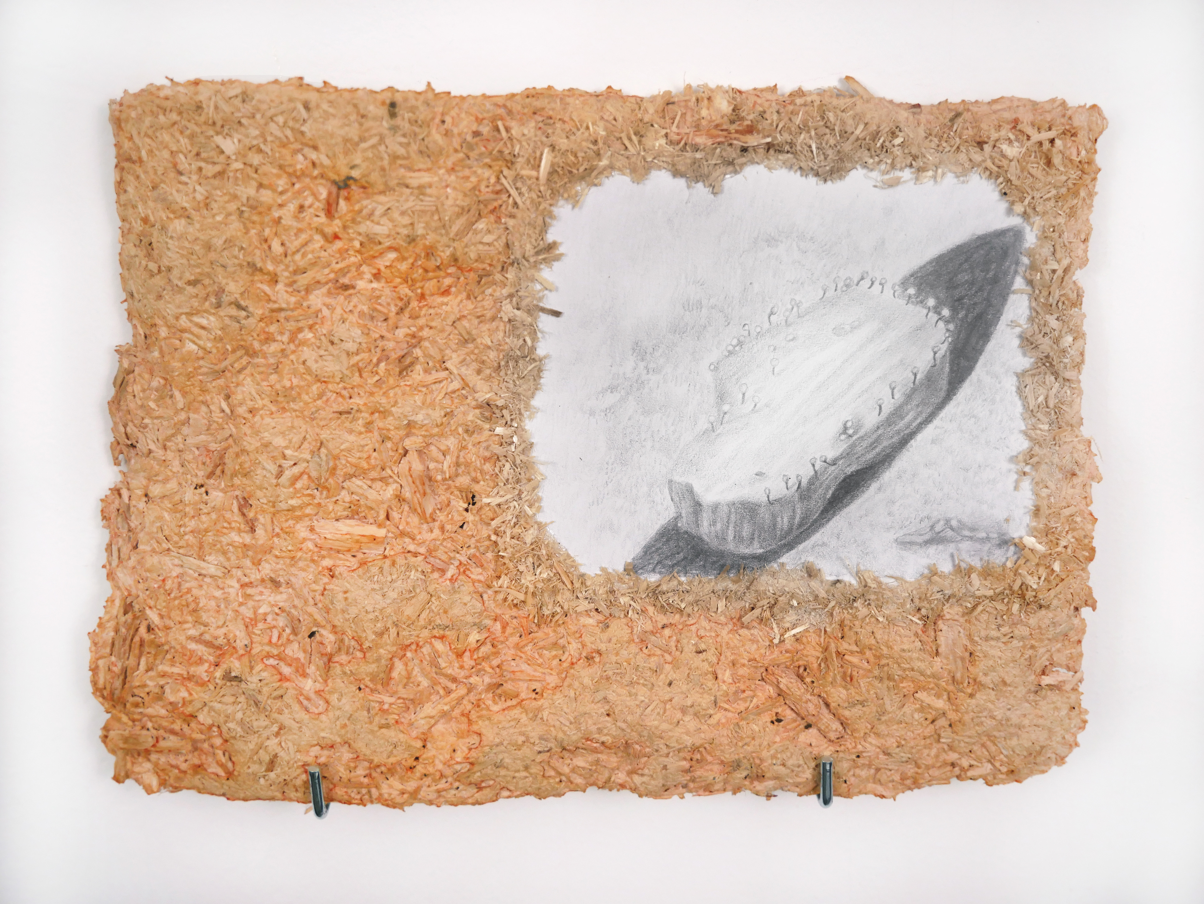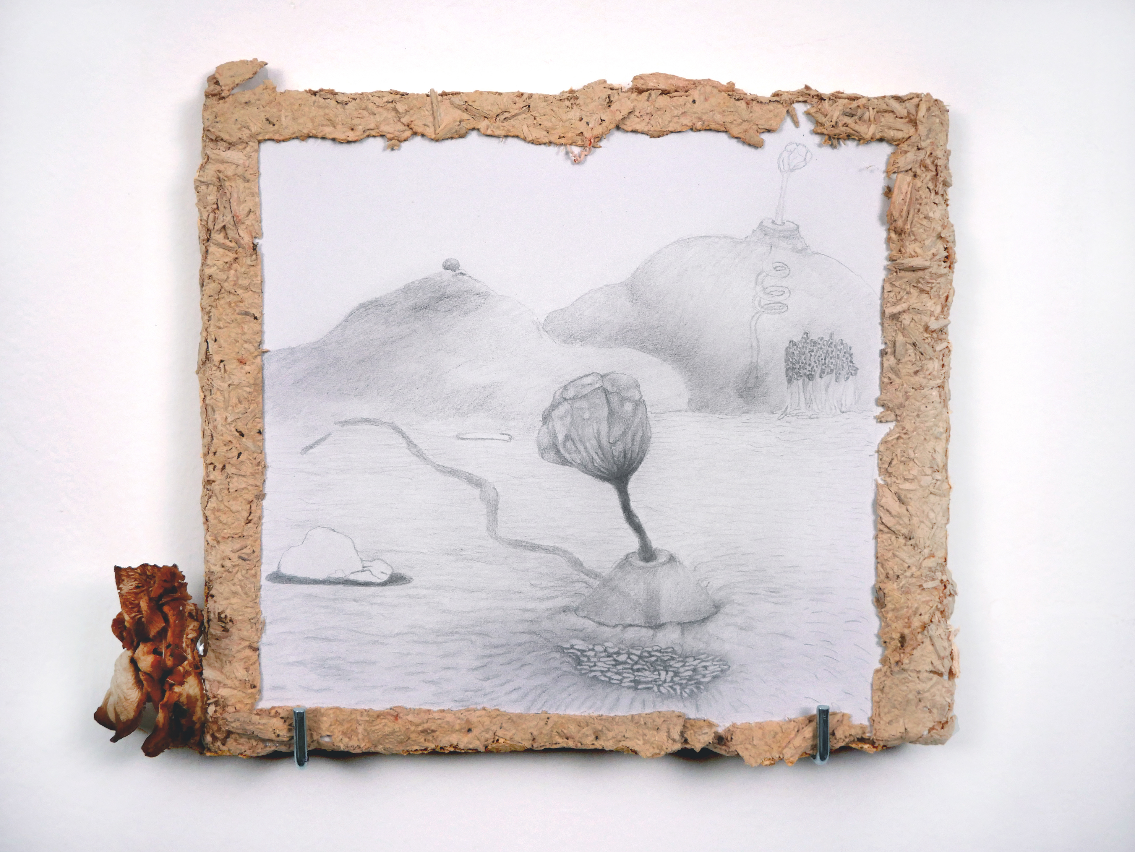 Material: Graphite on paper, wood, mycelium paper, dehydrated oyster mushroom